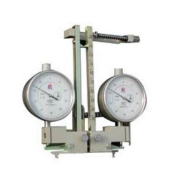 3、松開緊固螺釘調整測量表位置,使上刀口底面與底板上定位螺釘接觸。測量拉伸變形時,測量表起始位置應在指針正向行程0.1mm以上,然后固定好測量表,轉動測量表罩圈在需要的位置上。需注意,緊固測量表時,要保證測量表測桿能上下運動自如,不被卡住。如果重復使用,則不需每次試驗都要調整測量表位置。