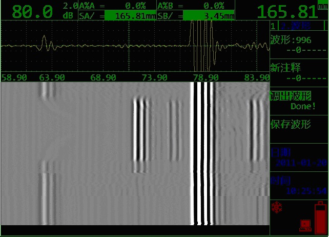- 支持灰度B掃功能,可顯示截面灰度B掃描,一個(gè)屏幕顯示豐富信息量,可用于簡(jiǎn)單TOFD應(yīng)用。(下圖為灰度B掃 功能顯示圖)